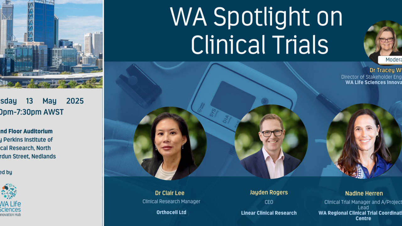 At this Spotlight event, we’ll hear from Jayden Rogers (CEO, Linear Clinical Research), Dr Clair Lee (Clinical Research Manager, Orthocell Ltd), and Nadine Herren (Clinical Trial Manager and Acting Project Lead, WA Regional Clinical Trial Coordinating Centre) as they share their insights from across the sector. We’ll explore how WA has built its reputation as a global clinical trials destination, how local companies can tap into this opportunity, and why strengthening our clinical trial ecosystem is critical for the future of research, healthcare, and economic growth in WA.