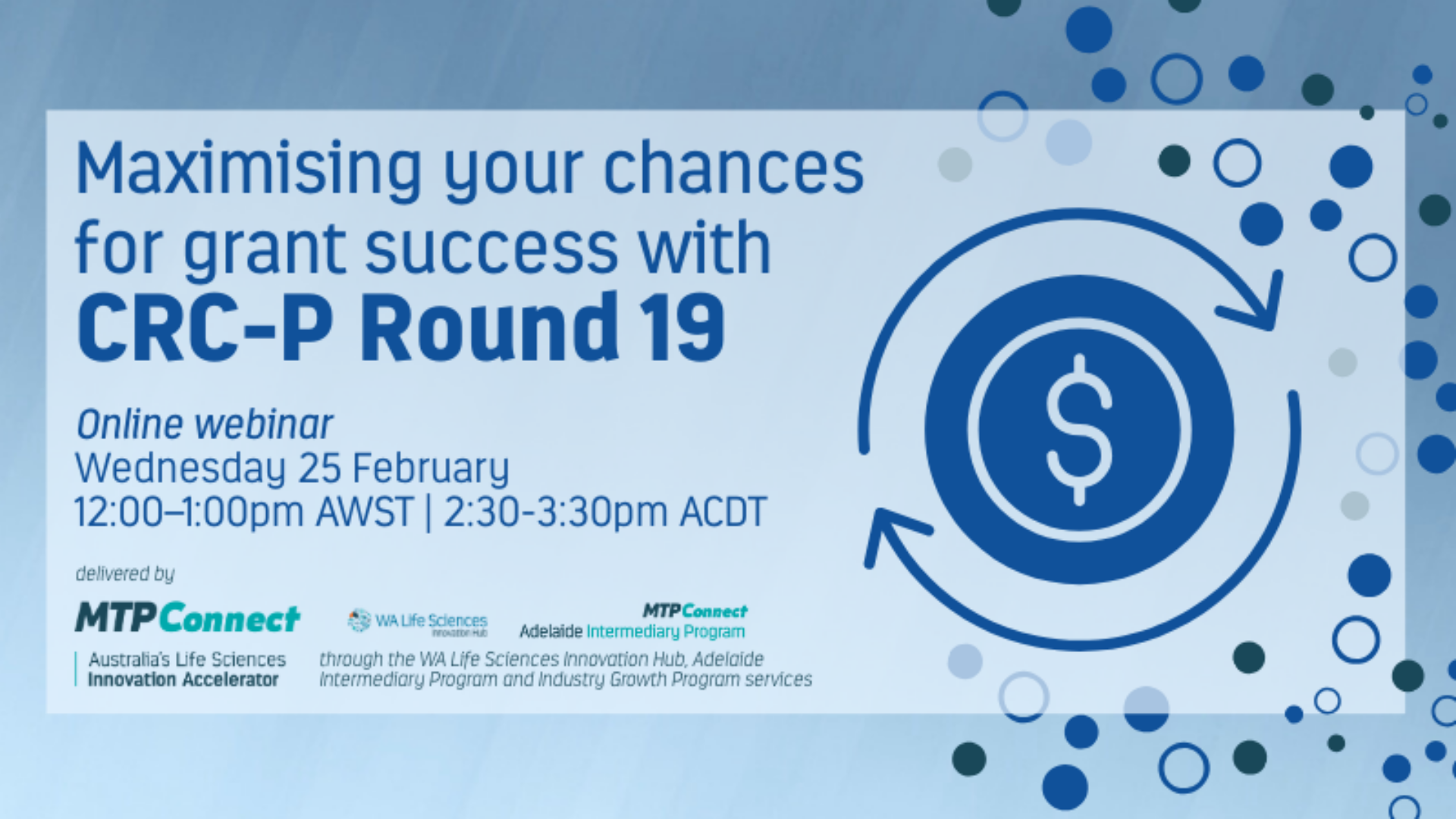 MTPConnect invites you to a practical webinar designed to help you build competitive Cooperative Research Centres-Projects (CRC-P) applications, delivered through our WA Life Sciences Innovation Hub (WALSIH), Adelaide Intermediary Program (AIP) and Industry Growth Program (IGP) service. This webinar is available exclusively to companies and innovators based in SA and WA, and/or IGP clients.